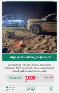 كما ضبطت القوات الخاصة للأمن البيئي مواطنًا مخالفًا لنظام البيئة لعدم الالتزام بتعليمات وإرشادات المحافظة على الغطاء النباتي بإشعال النار في غير الأماكن المخصصة لها في محمية الملك عبدالعزيز الملكية، وطبقت بحقه الإجراءات النظامية. وأكدت القوات أن عقوبة إشعال النار في غير الأماكن المخصصة لها في الغابات والمتنزهات الوطنية غرامة تصل إلى (3,000) ريال.