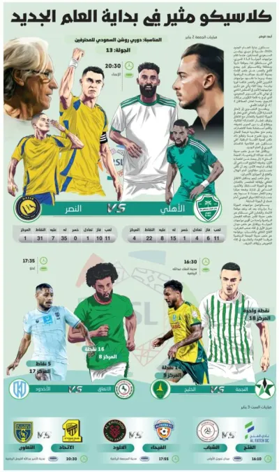 ستكون بداية العام الجديد 2026، مثيرة في دوري روشن السعودي للمحترفين، عندما تقام مواجهات الجولة الـ13 للدوري، التي ستنطلق غدا، بموقعة…