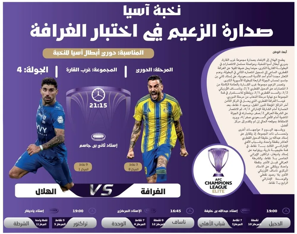 يطمح الهلال إلى الابتعاد بصدارة مجموعة غرب القارة، بدوري أبطال آسيا للنخبة، ومواصلة مسلسل الانتصارات في البطولة القارية الكبرى، حينما يحل ضيفا ثقيلا على الغرافة القطري، الساعي إلى تسجيل انتصاره الثاني في البطولة، وعدم التعثر مجددا أمام أحد الأندية السعودية، على إستاد ثاني بن جاسم، لحساب الجولة الرابعة للبطولة الآسيوية الكبرى.