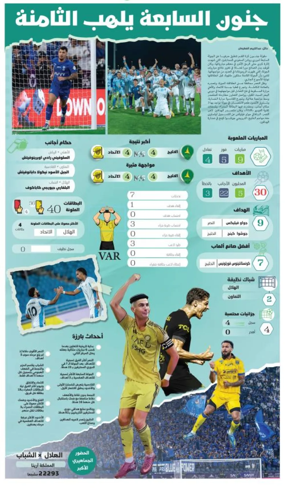 مقولة جنون كرة القدم تنطبق حرفيا على الجولة السابعة لدوري روشن السعودي للمحترفين، التي شهدت إثارة كبرى حتى الرمق الأخير في معظم مبارياتها، وكان للوقت بدل الضائع دورا فعالا في تغيير نتائج مباريات الجولة، التي ظهرت الريمونتادا في العديد من مواجهاتها، لتنبئ بأن الجولة الثامنة ستكون ملتهبة، قبل انطلاقتها نهاية الأسبوع الجاري.