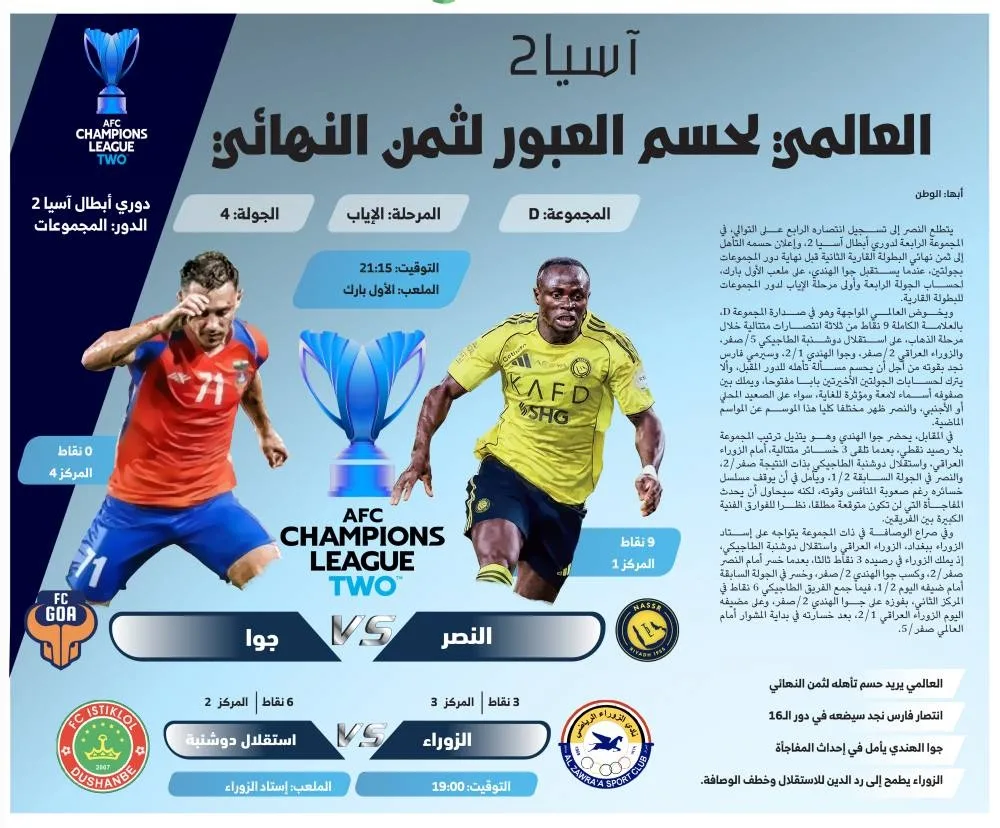 يتطلع النصر إلى تسجيل انتصاره الرابع على التوالي، في المجموعة الرابعة لدوري أبطال آسيا 2، وإعلان حسمه التأهل إلى ثمن نهائي البطولة القارية الثانية قبل نهاية دور المجموعات بجولتين، عندما يستقبل جوا الهندي، على ملعب الأول بارك، لحساب الجولة الرابعة وأولى مرحلة الإياب لدور المجموعات للبطولة القارية.