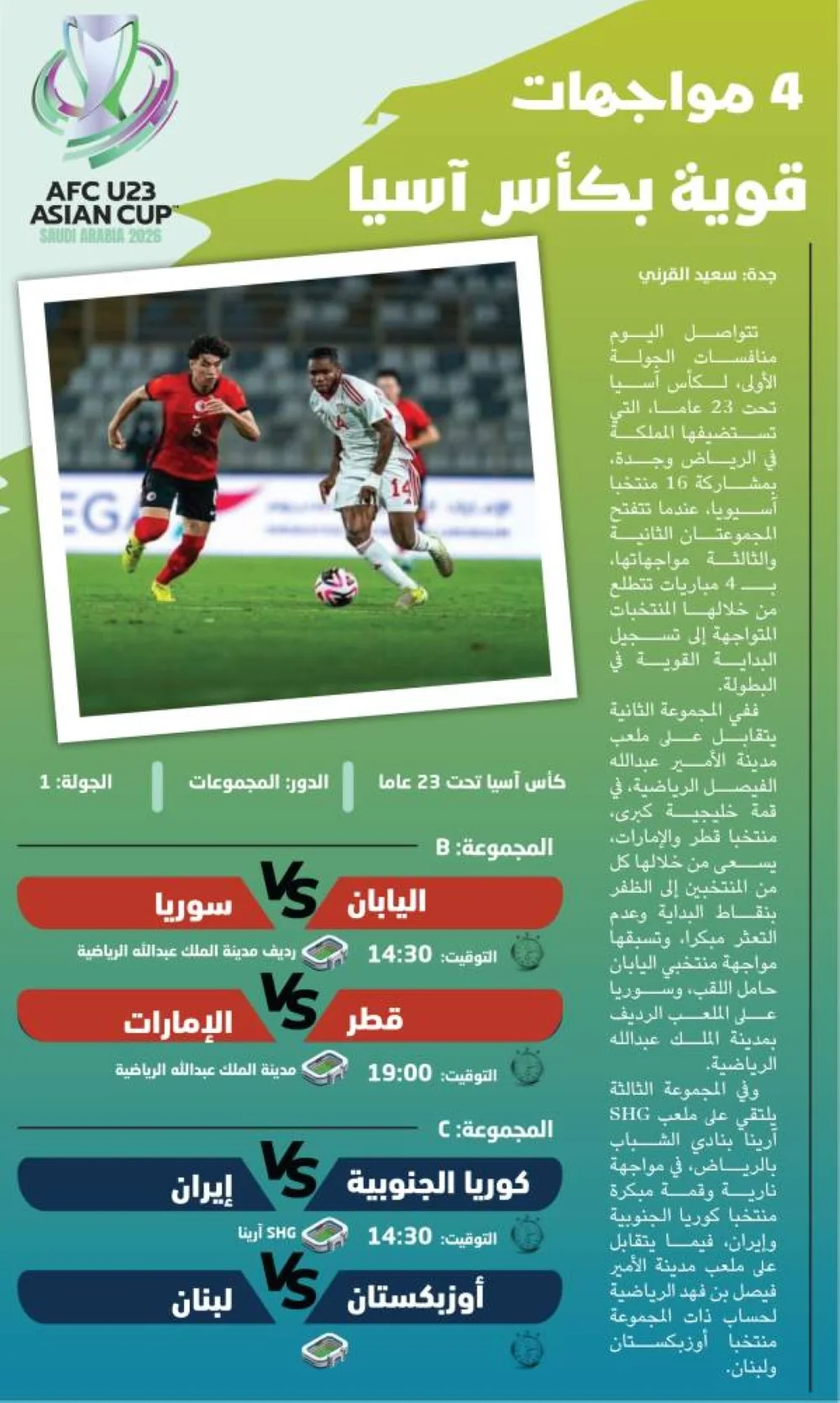 تتواصل اليوم منافسات الجولة اﻷولى، لكأس آسيا تحت 23 عاما، التي تستضيفها المملكة في الرياض وجدة، بمشاركة 16 منتخبا آسيويا، عندما تتفتح المجموعتان الثانية والثالثة مواجهاتها، بـ 4 مباريات تتطلع من خلالها المنتخبات المتواجهة إلى تسجيل البداية القوية في البطولة.