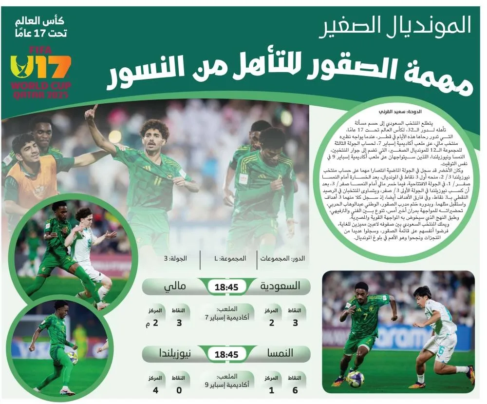يتطلع المنتخب السعودي إلى حسم مسألة تأهله لدور الـ32، لكأس العالم تحت 17 عامًا، التي تدور رحاها هذه الأيام في قطر، عندما يواجه نظيره منتخب مالي، على ملعب أكاديمية إسباير 7، لحساب الجولة الثالثة للمجموعة الـ12 للمونديال الصغير، التي تضم إلى جوار المنتخبين، النمسا ونيوزيلندا، اللذين سيتواجهان على ملعب أكاديمية إسباير 9 في نفس التوقيت.