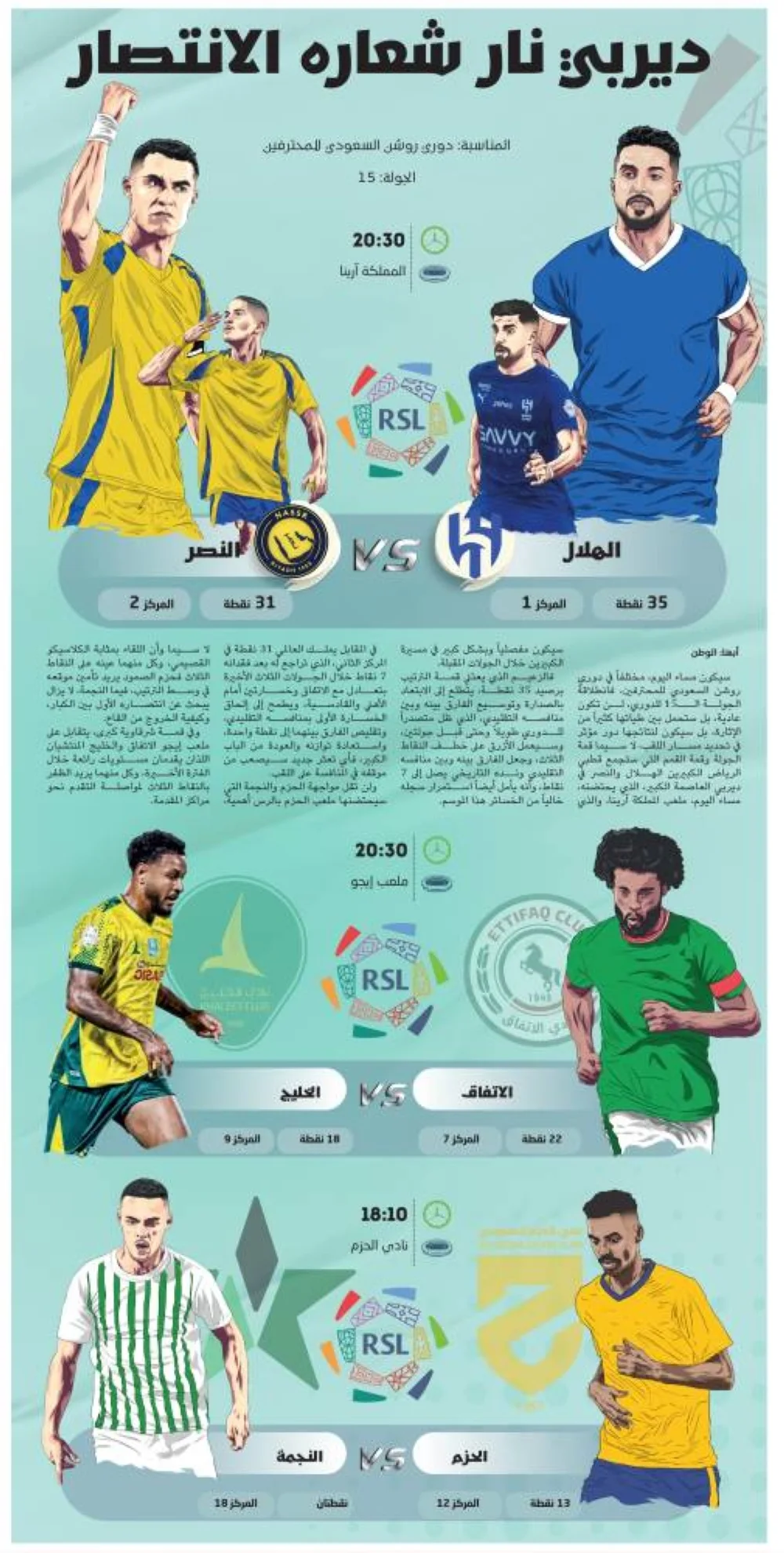 سيكون مساء اليوم، مختلفاً في دوري روشن السعودي للمحترفين، فانطلاقة الجولة الـ15 للدوري، لن تكون عادية، بل ستحمل بين طياتها كثيراً من اﻹثارة، بل سيكون لنتائجها دور مؤثر في تحديد مسار اللقب، ﻻ سيما قمة الجولة وقمة القمم التي ستجمع قطبي الرياض الكبيرين الهلال والنصر في ديربي العاصمة الكبير، الذي يحتضنه، مساء اليوم، ملعب المملكة آرينا، والذي سيكون مفصلياً وبشكل كبير في مسيرة الكبيرين خلال الجولات المقبلة.