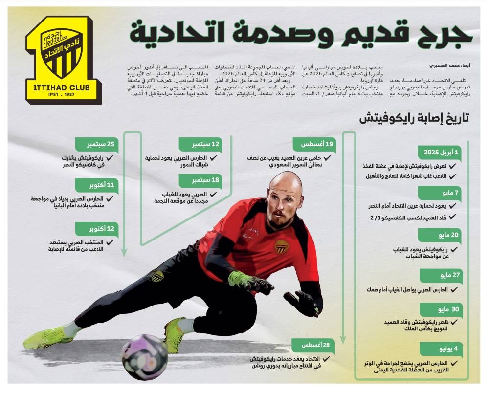 تلقى الاتحاد خبرا صادما، بعدما تعرض حارس مرماه، الصربي بريدراج رايكوفيتش للإصابة، خلال وجوده مع منتخب بلاده لخوض مباراتي ألبانيا وأندورا في تصفيات كأس العالم 2026 عن قارة أوروبا.