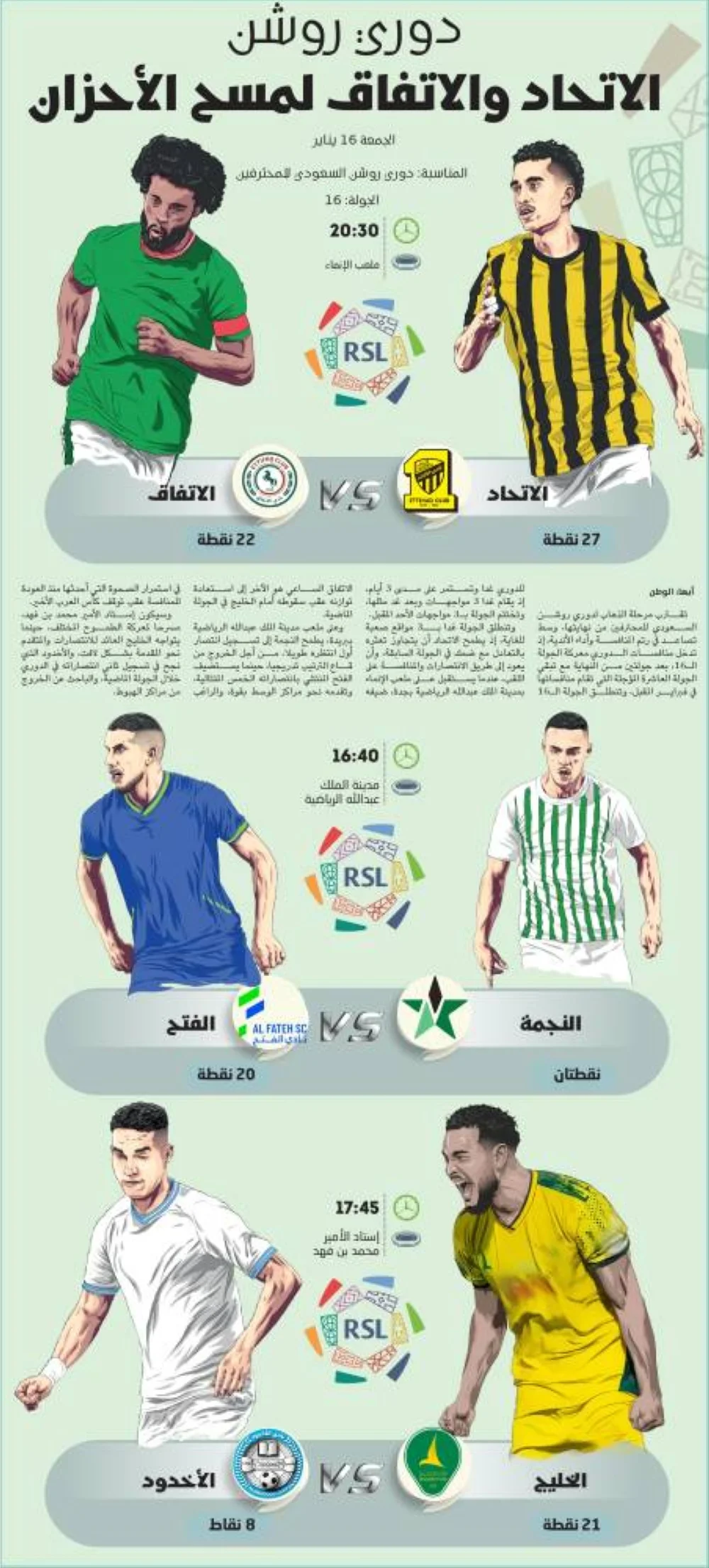 وتنطلق الجولة غدا بـ3 مواقع صعبة للغاية، إذ يطمح الاتحاد أن يتجاوز تعثره بالتعادل مع ضمك في الجولة السابقة، وأن يعود إلى طريق الانتصارات والمنافسة على اللقب، عندما يستقبل على ملعب اﻹنماء بمدينة الملك عبدالله الرياضية بجدة، ضيفه الاتفاق الساعي هو الآخر إلى استعادة توازنه عقب سقوطه أمام الخليج في الجولة الماضية.
