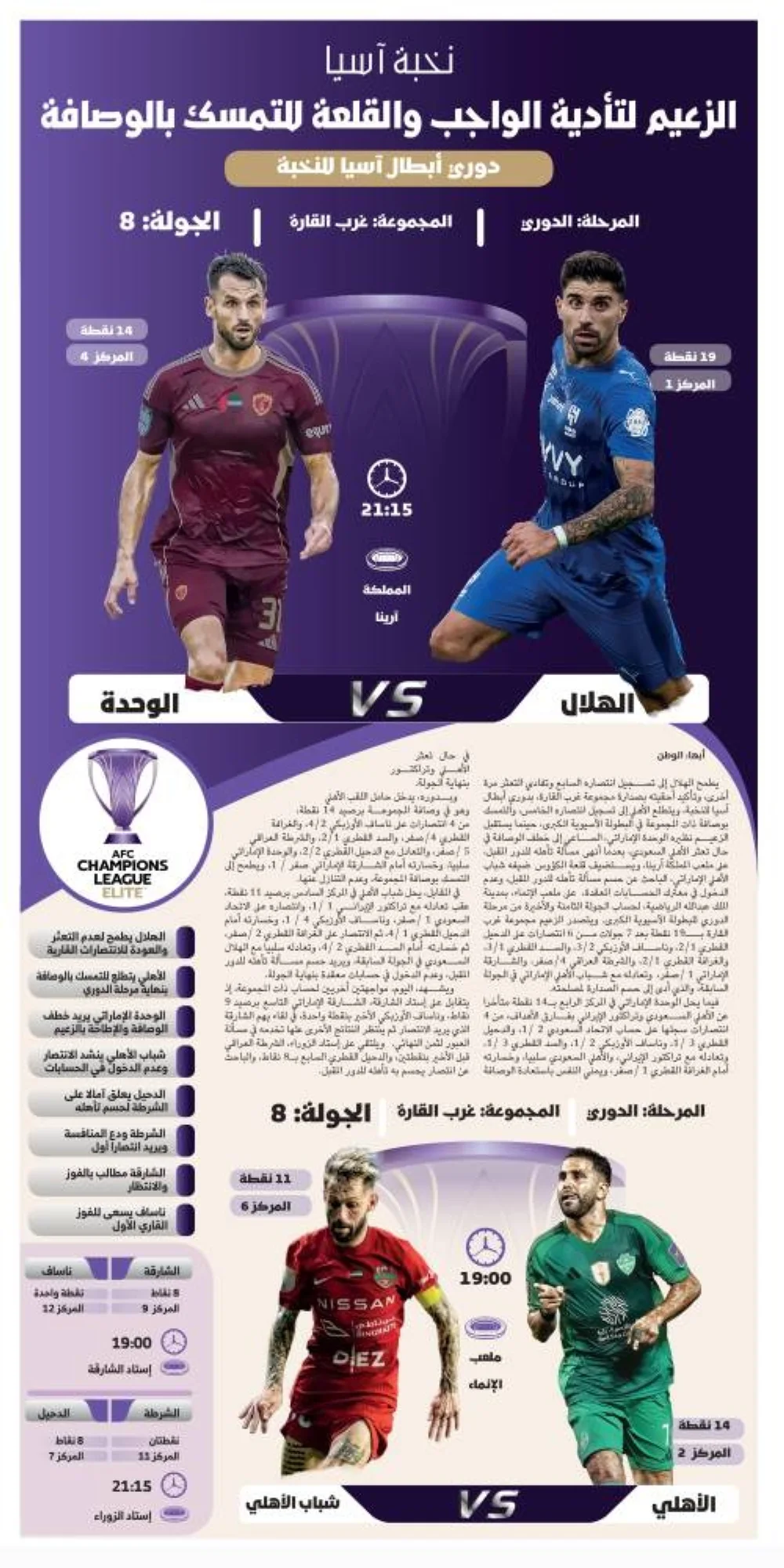 يطمح الهلال إلى تسجيل انتصاره السابع وتفادي التعثر مرة أخرى، وتأكيد أحقيته بصدارة مجموعة غرب القارة، بدوري أبطال آسيا للنخبة، ويتطلع الأهلي إلى تسجيل انتصاره الخامس، والتمسك بوصافة ذات المجموعة في البطولة الآسيوية الكبرى، حينما يستقبل الزعيم نظيره الوحدة الإماراتي، الساعي إلى خطف الوصافة في حال تعثر الأهلي السعودي، بعدما أنهى مسألة تأهله للدور المقبل، على ملعب المملكة آرينا، ويستضيف قلعة الكؤوس ضيفه شباب الأهلي الإماراتي، الباحث عن حسم مسألة تأهله للدور المقبل، وعدم الدخول في معترك الحسابات المعقدة، على ملعب الإنماء، بمدينة الملك عبدالله الرياضية، لحساب الجولة الثامنة والأخيرة من مرحلة الدوري للبطولة الآسيوية الكبرى.