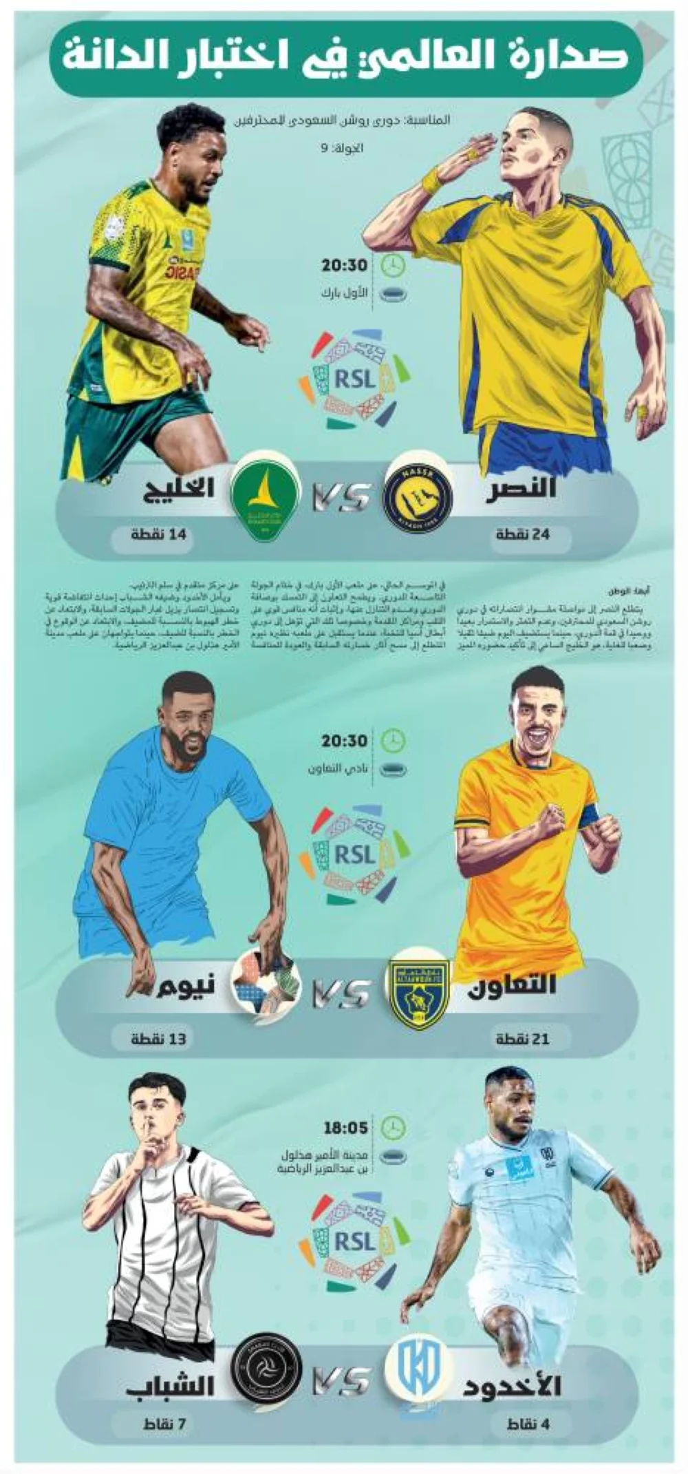 يتطلع النصر إلى مواصلة مشوار انتصاراته في دوري روشن السعودي للمحترفين، وعدم التعثر والاستمرار بعيدا ووحيدا في قمة الدوري، حينما يستضيف اليوم ضيفا ثقيلا وصعبا للغاية، هو الخليج الساعي إلى تأكيد حضوره المميز في الموسم الحالي، على ملعب الأول بارك، في ختام الجولة التاسعة للدوري. ويطمح التعاون إلى التمسك بوصافة الدوري وعدم التنازل عنها، وإثبات أنه منافس قوي على اللقب ومراكز المقدمة وخصوصا تلك التي تؤهل إلى دوري أبطال آسيا للنخبة، عندما يستقبل على ملعبه نظيره نيوم المتطلع إلى مسح آثار خسارته السابقة والعودة للمنافسة على مركز متقدم في سلم الترتيب.