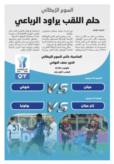 يحتضن ملعب الأول بارك مواجهات كأس السوبر الإيطالي، الذي تستضيفه الرياض للمرة الخامسة، والسادسة على الملاعب السعودية، إذ استضافت…