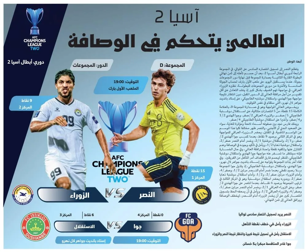 يتطلع النصر إلى تسجيل انتصاره السادس على التوالي، في المجموعة الرابعة لدوري أبطال آسيا 2، بعد أن حسم تأهله إلى ثمن نهائي البطولة القارية الثانية بصدارة المجموعة قبل نهاية دور المجموعات بجولة، عندما يستقبل اليوم، على ملعب الأول بارك، لحساب الجولة السادسة والأخيرة من دوري المجموعات للبطولة، نظيره الزوراء العراقي، في مواجهة تهم الضيف بشكل كبير إذ ينشد التعادل على أقل تقدير من أجل مرافقة العالمي إلى الدور المقبل، دون انتظار نتيجة مواجهة جوا الهندي، واستقلال دوشنبه الطاجيكي، على إستاد بانديت جواهر لال نهرو، التي ستقام في نفس التوقيت.